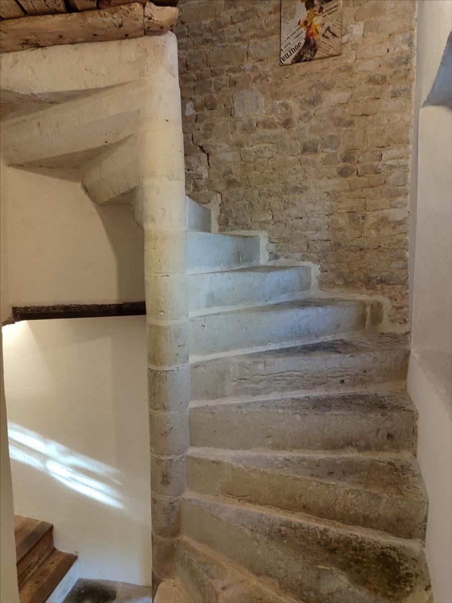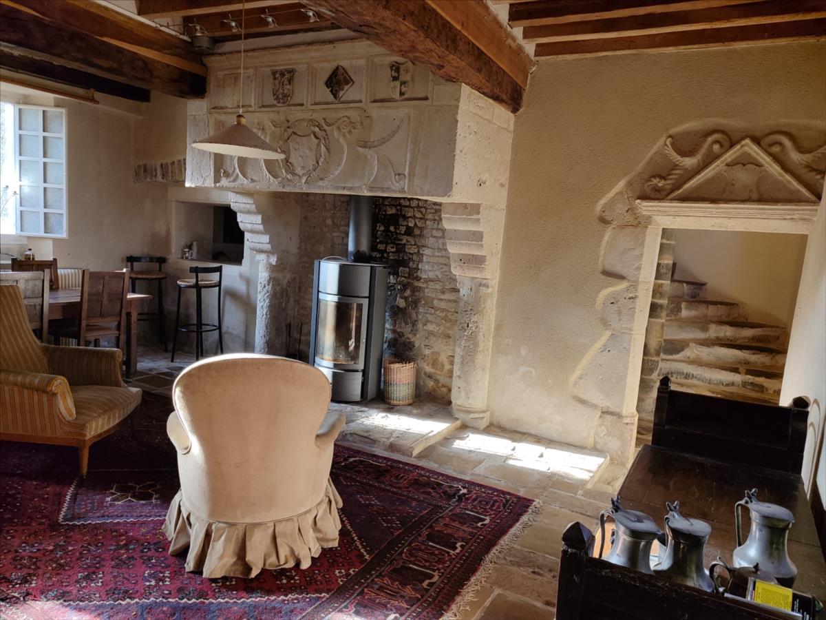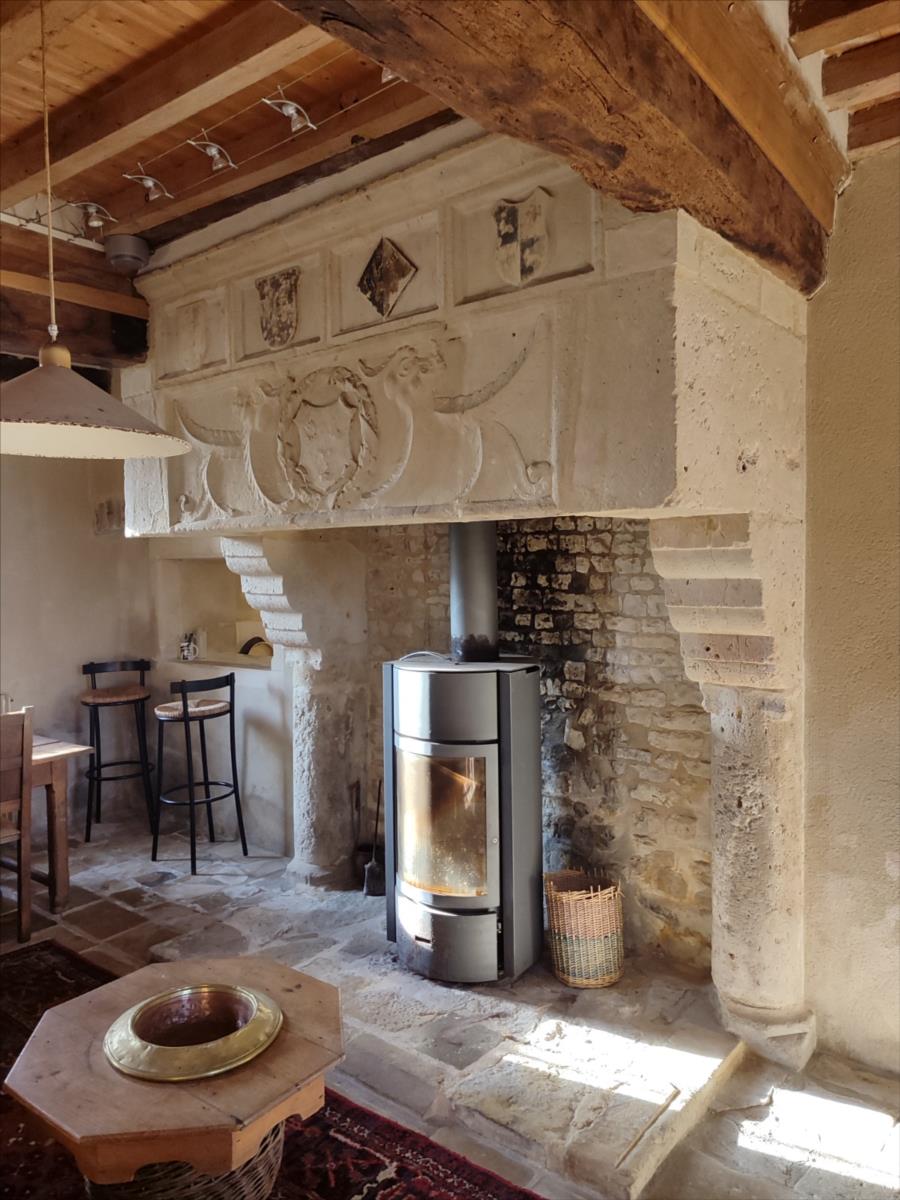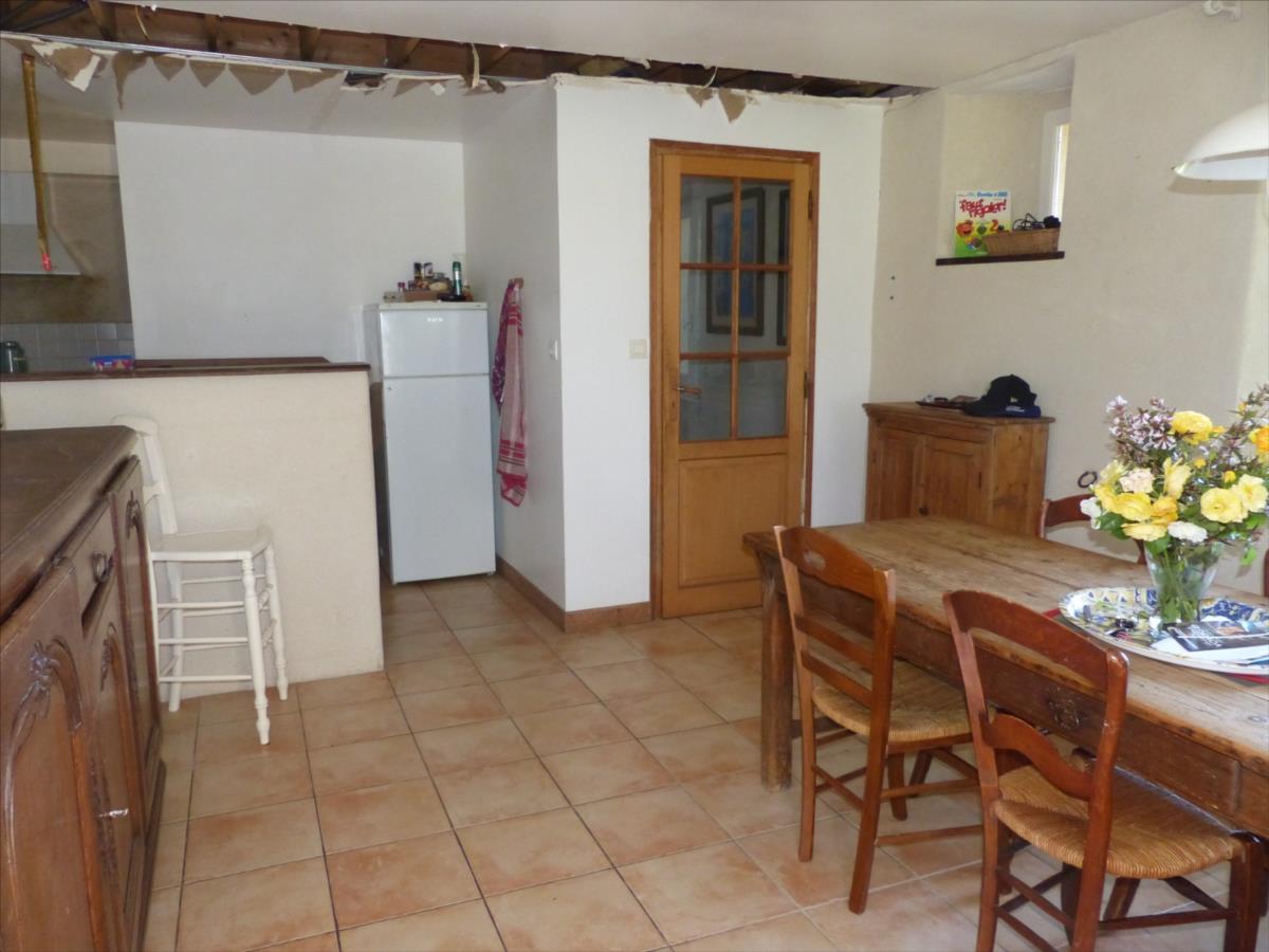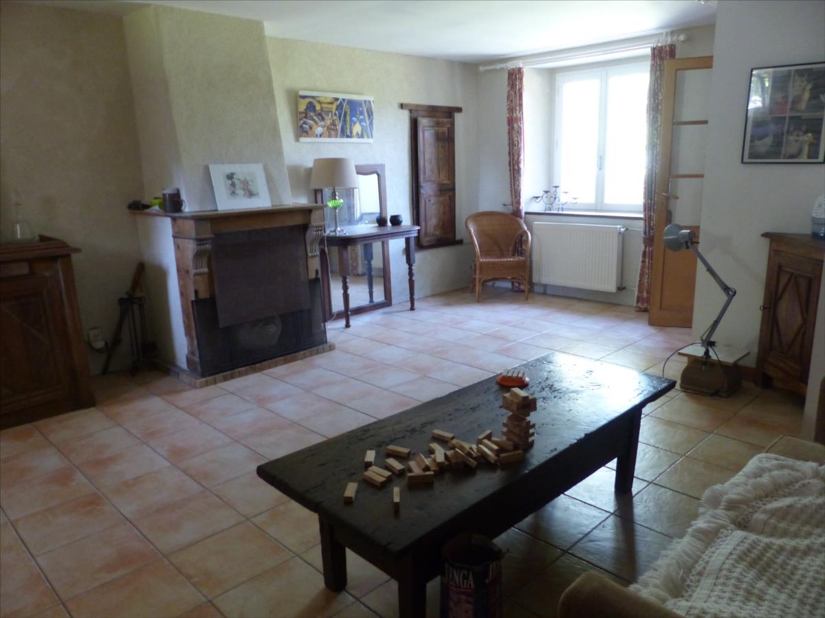 1°) Maison principale de 197m², en pierre couverte en ardoise, mitoyenne d'un côté, offrant au rez-de-chaussée : entrée, salle à manger avec cheminée (poêle à bois), cuisine aménagée, salon avec cheminée, escalier en pierre.