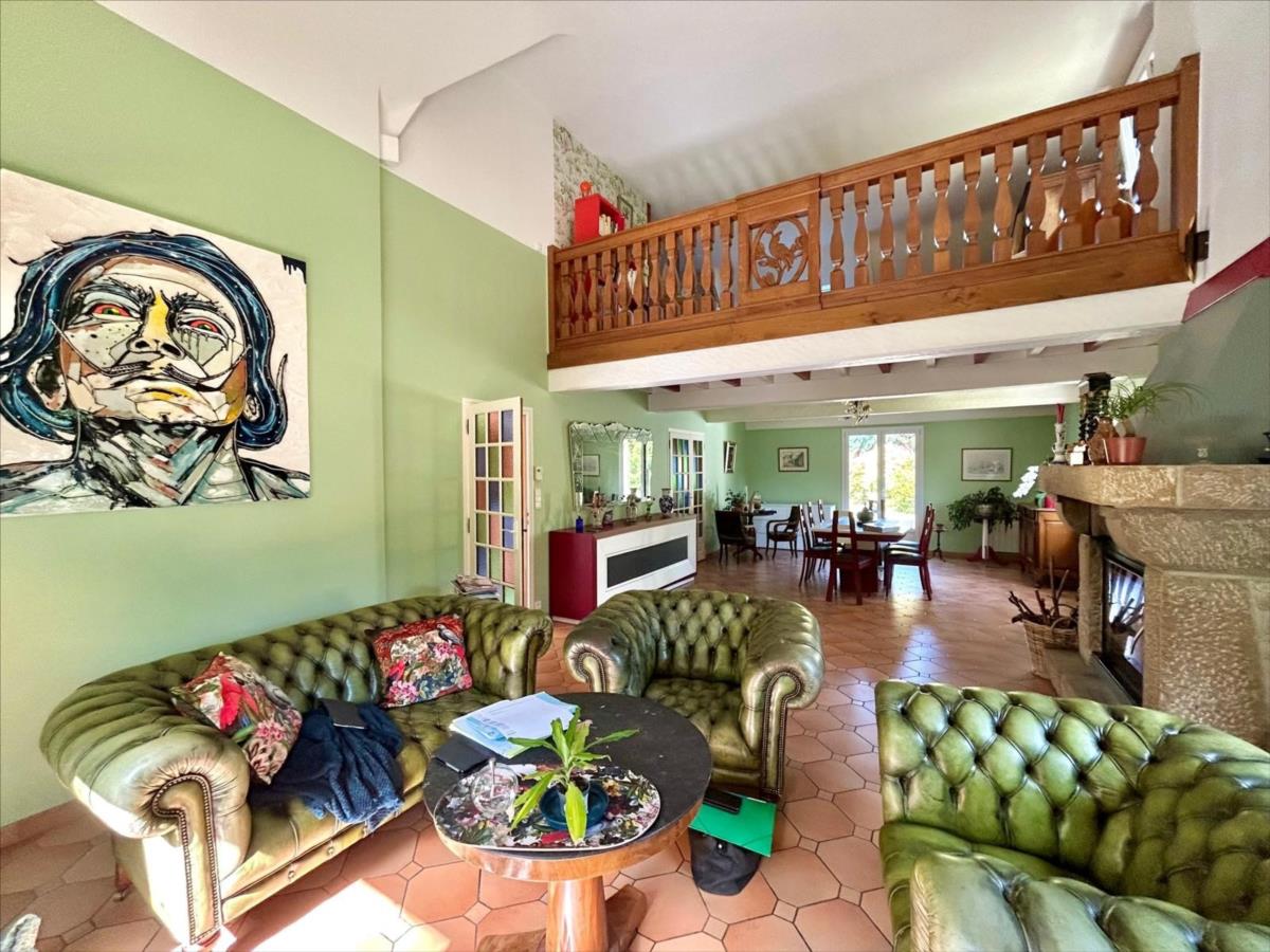 Entrée , superbe pièce de vie ouverte sur une mezzanine (cheminée-insert), cuisine aménagée accédant à une terrasse ouvrant sur le jardin. Dégagement/couloir distribuant WC, salle d'eau, bureau (chambre de plain-pied possible), placards, cellier, atelier, buanderie.