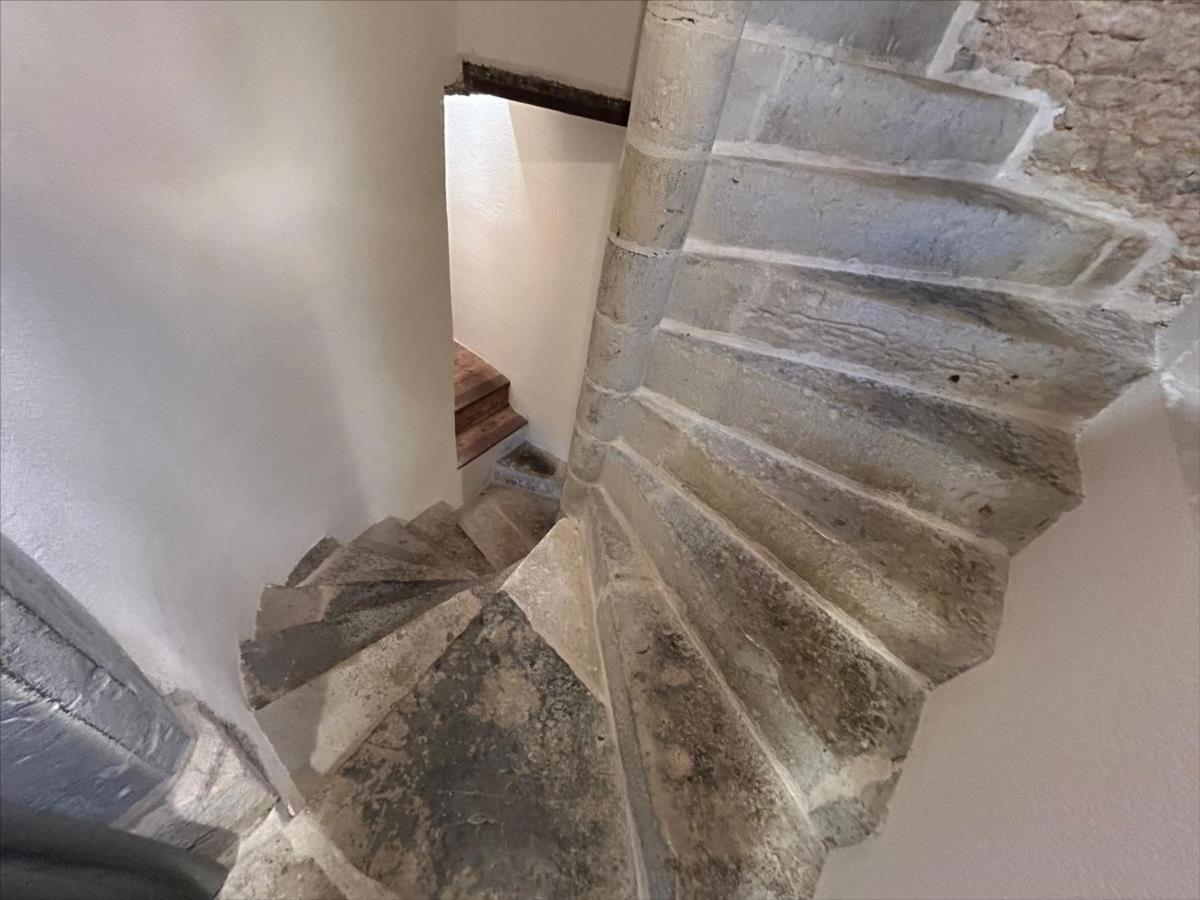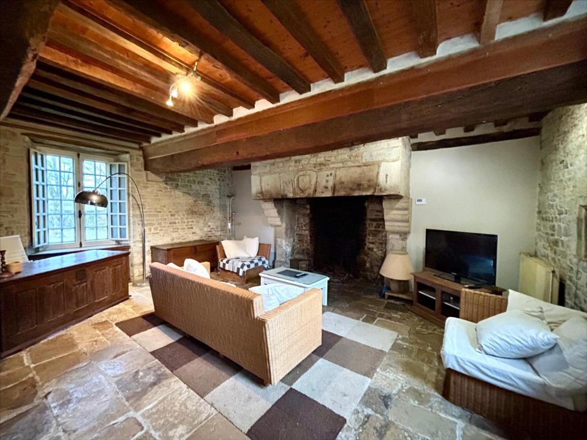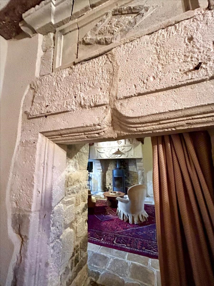1°) Maison principale en pierre couverte en ardoise, offrant au rez-de-chaussée : entrée, salle à manger avec une très belle cheminée (poêle à bois), cuisine aménagée, salon avec cheminée, escalier en pierre.