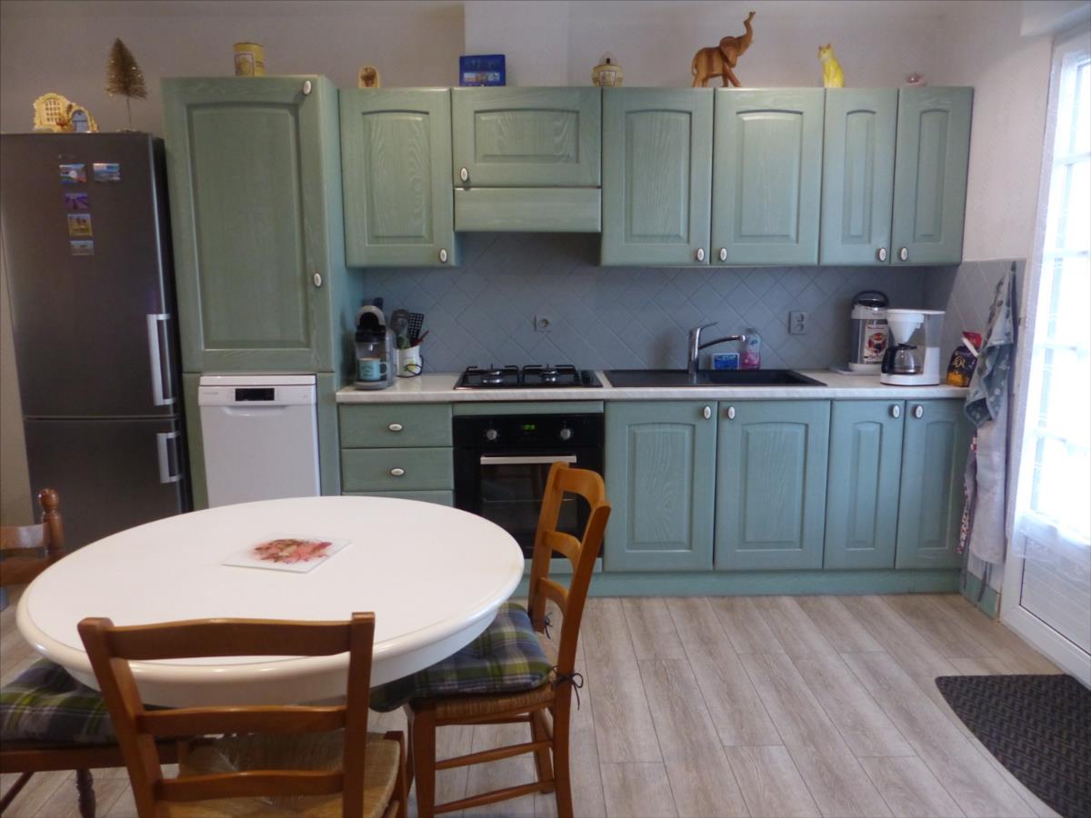 Rez-de-chaussée : entrée/couloir, cuisine aménagée et équipée, salle-salon, 2 chambres, wc, salle de bains (baignoire et douche).